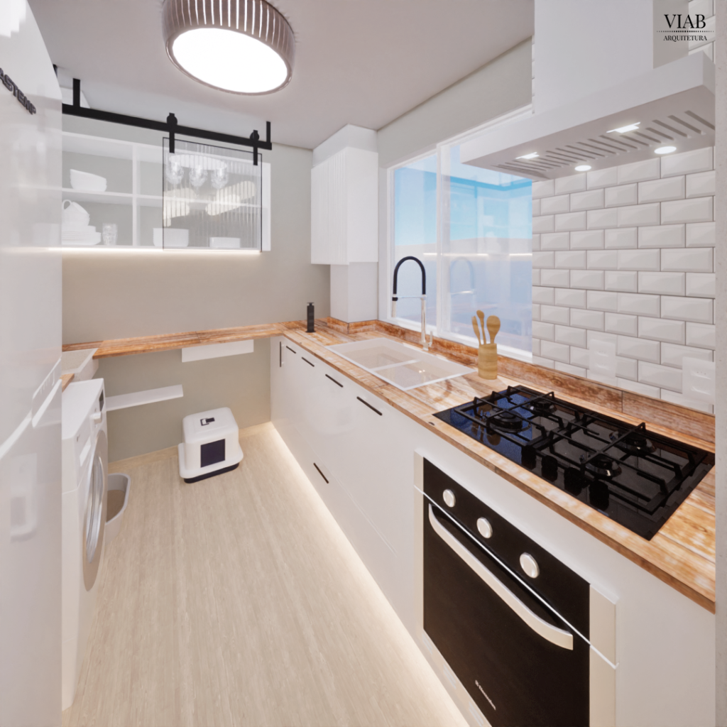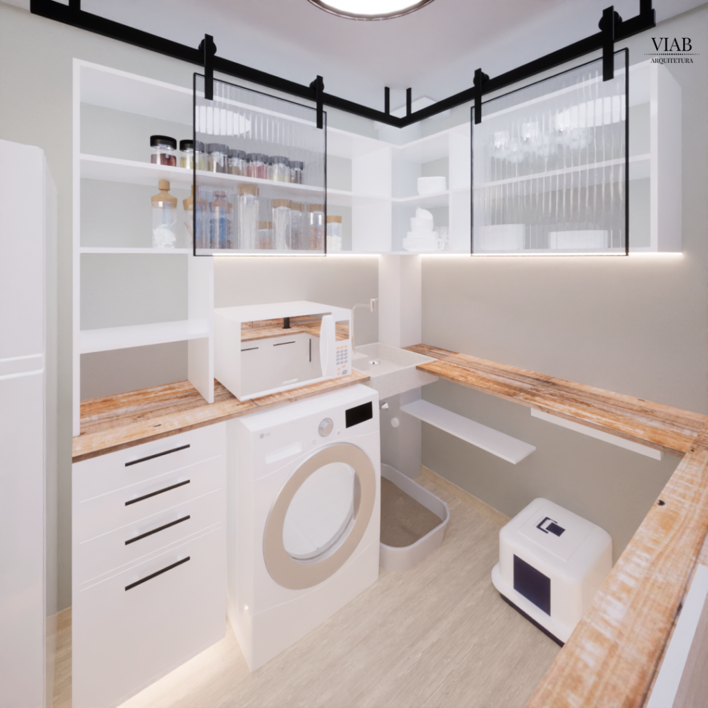 A cozinha foi um grande desafio! Além de um bom espaço de bancada e armários, ela é dividida com a lavanderia, que além de uma máquina lava e seca, precisa comportar um espaço de varal e o banheiros dos PET’s.