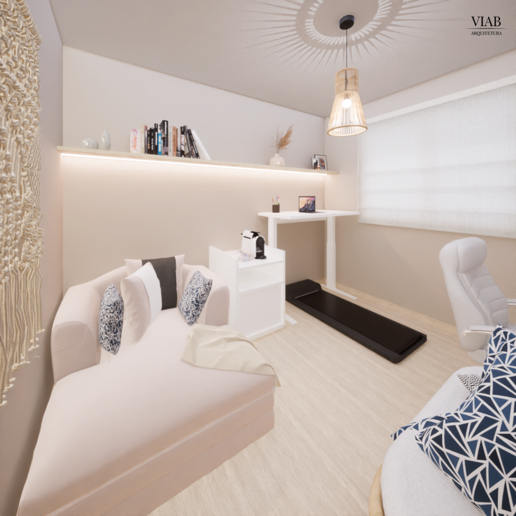 Um dos quartos deveria atender a demanda de home office da cliente, junto com um espaço para receber visitas.