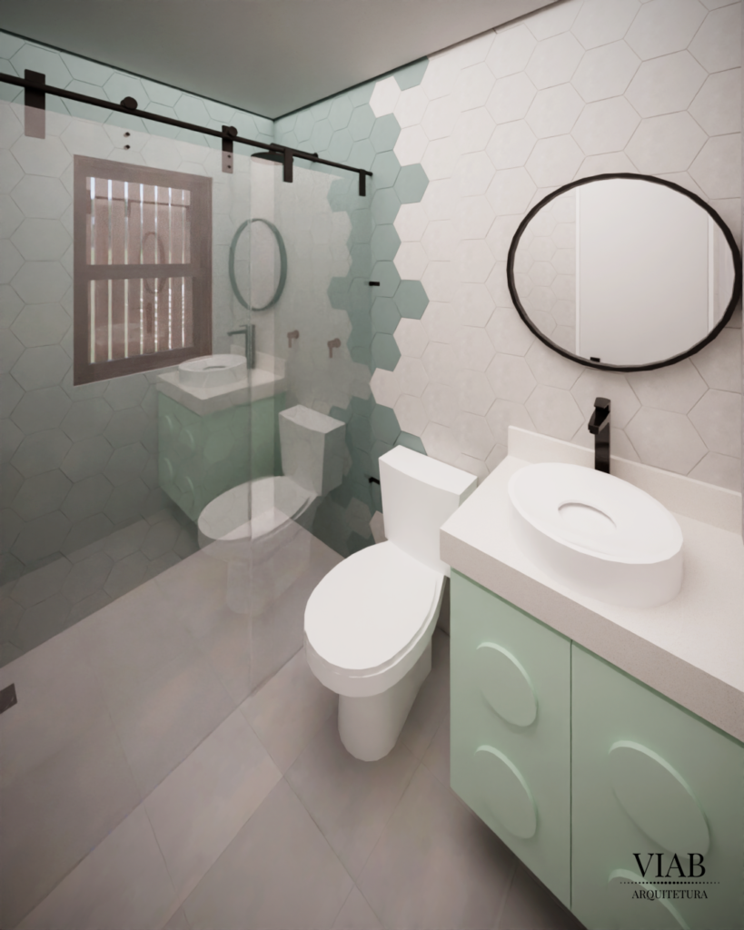 O banheiro segue a proposta criativa, com revestimentos hexagonais, marcenaria com tema LEGO e equilíbrio entre cores suaves e elementos marcantes, como metais pretos e cimento queimado. Um ambiente inteligente, divertido e que respeita a diferença de idade entre os irmãos.