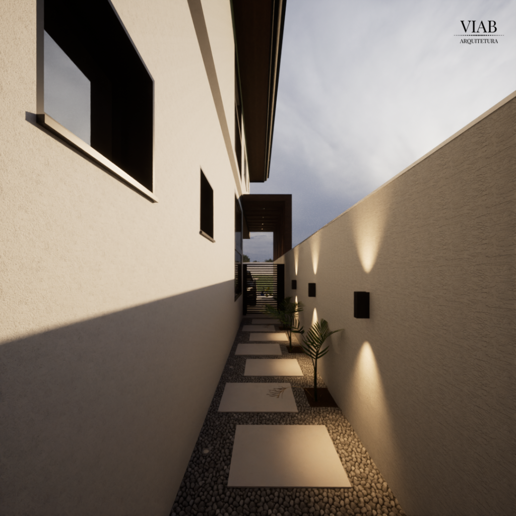 Até o corredor lateral ganhou destaque: com piso de pedriscos, placas de fulget, arandelas suaves e vegetação, o espaço obrigatório virou um prolongamento da área social, reforçando a proposta de funcionalidade com beleza.