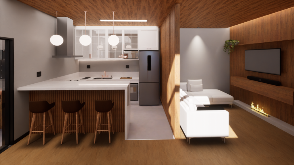 Na área social, a cozinha foi integrada às salas, com divisória ripada em madeira para delimitar o espaço sem perder fluidez. Toda a marcenaria foi planejada com cuidado, mantendo tons neutros e madeira como destaque principal.