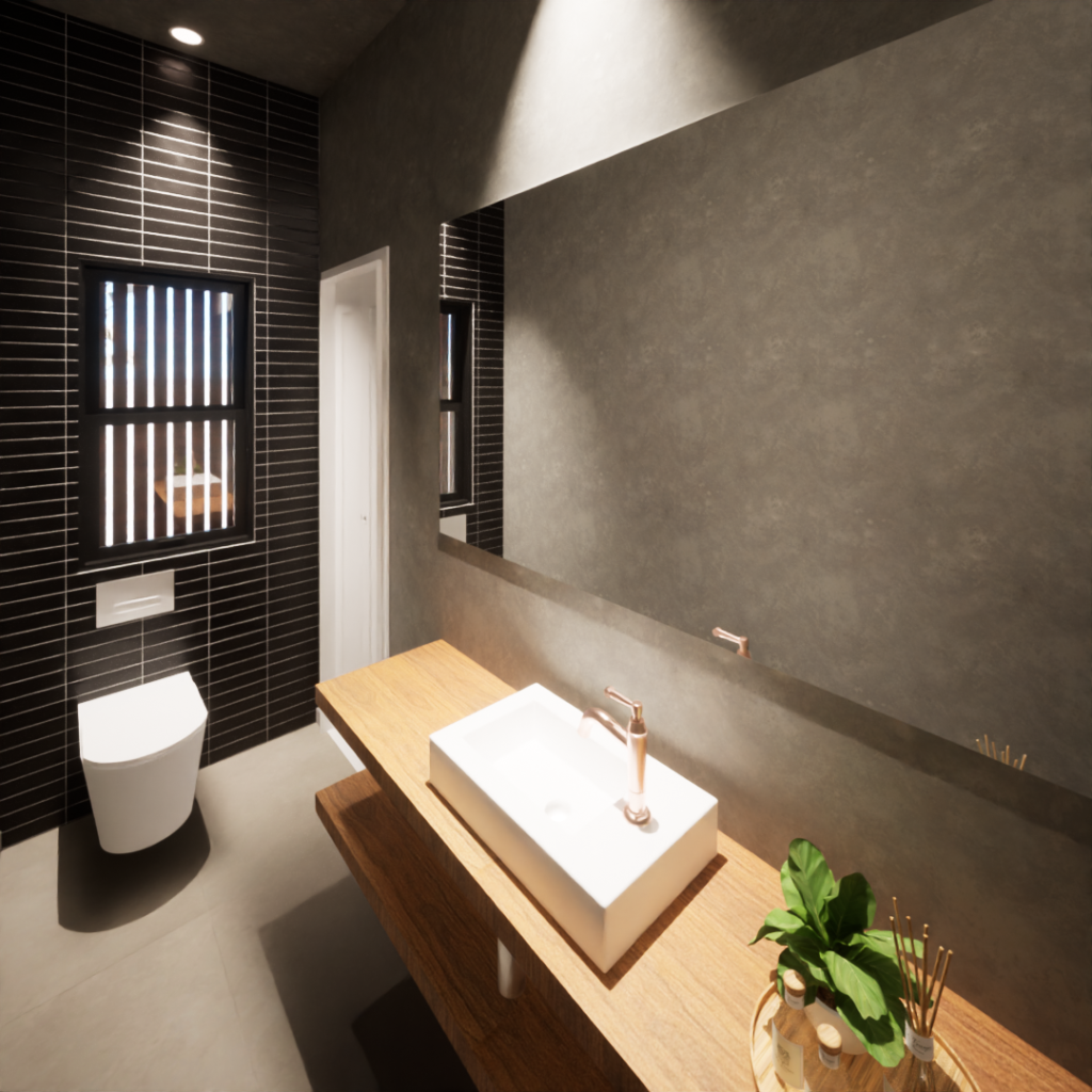O lavabo traz ousadia e personalidade: piso, paredes e forro em cimento queimado, bancada em madeira e revestimento metrô preto. A iluminação amarelada dá o toque final de aconchego que o ambiente precisava.