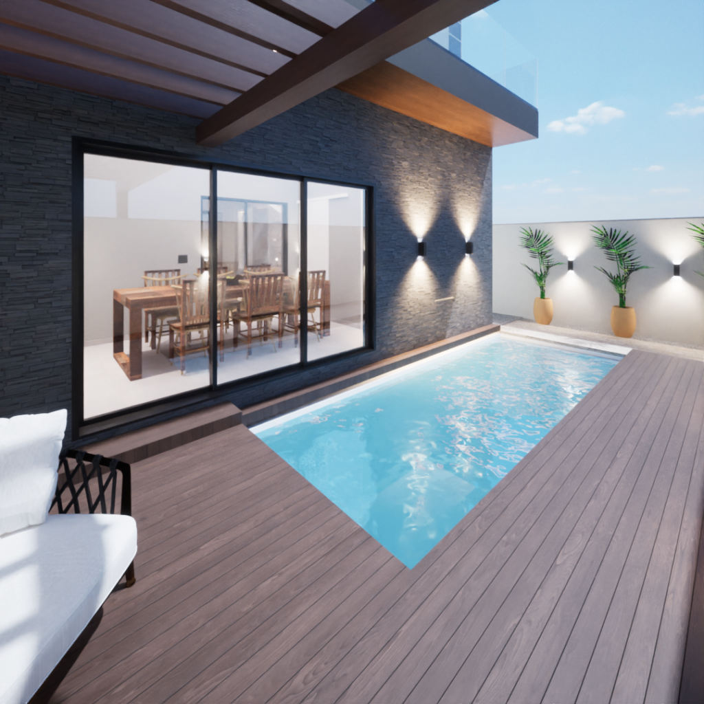 Criamos um quintal espaçoso, com piscina, deck de madeira e um canto de descanso para os pais, voltado para o lazer e o convívio.