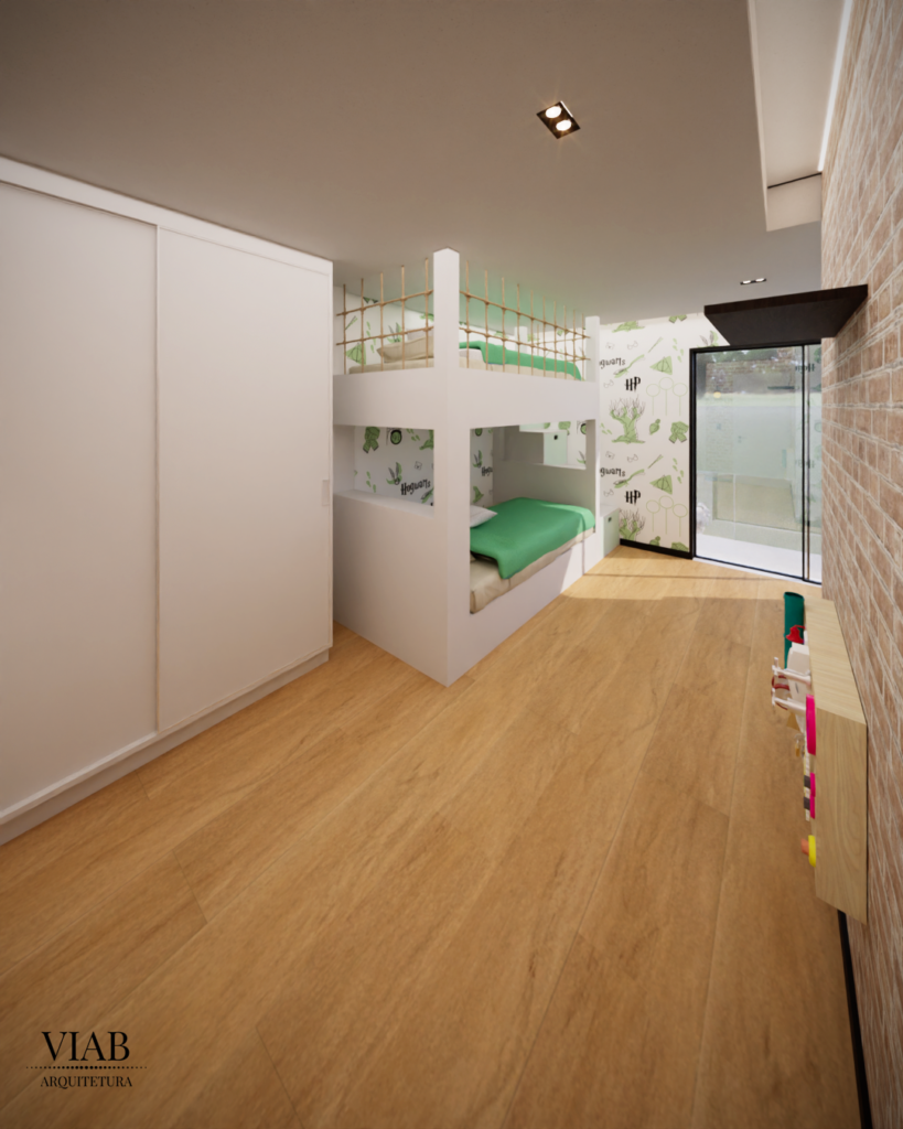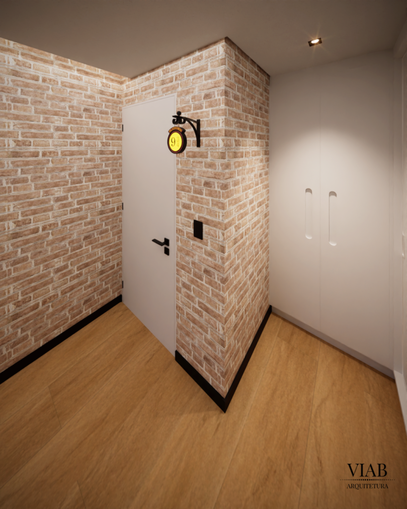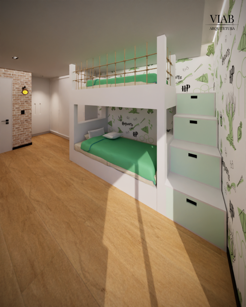 A suíte dos filhos é um dos pontos altos deste projeto. Inspirado na saga Harry Potter, o quarto traz referências lúdicas, como a plataforma 9¾ e papel de parede temático.
